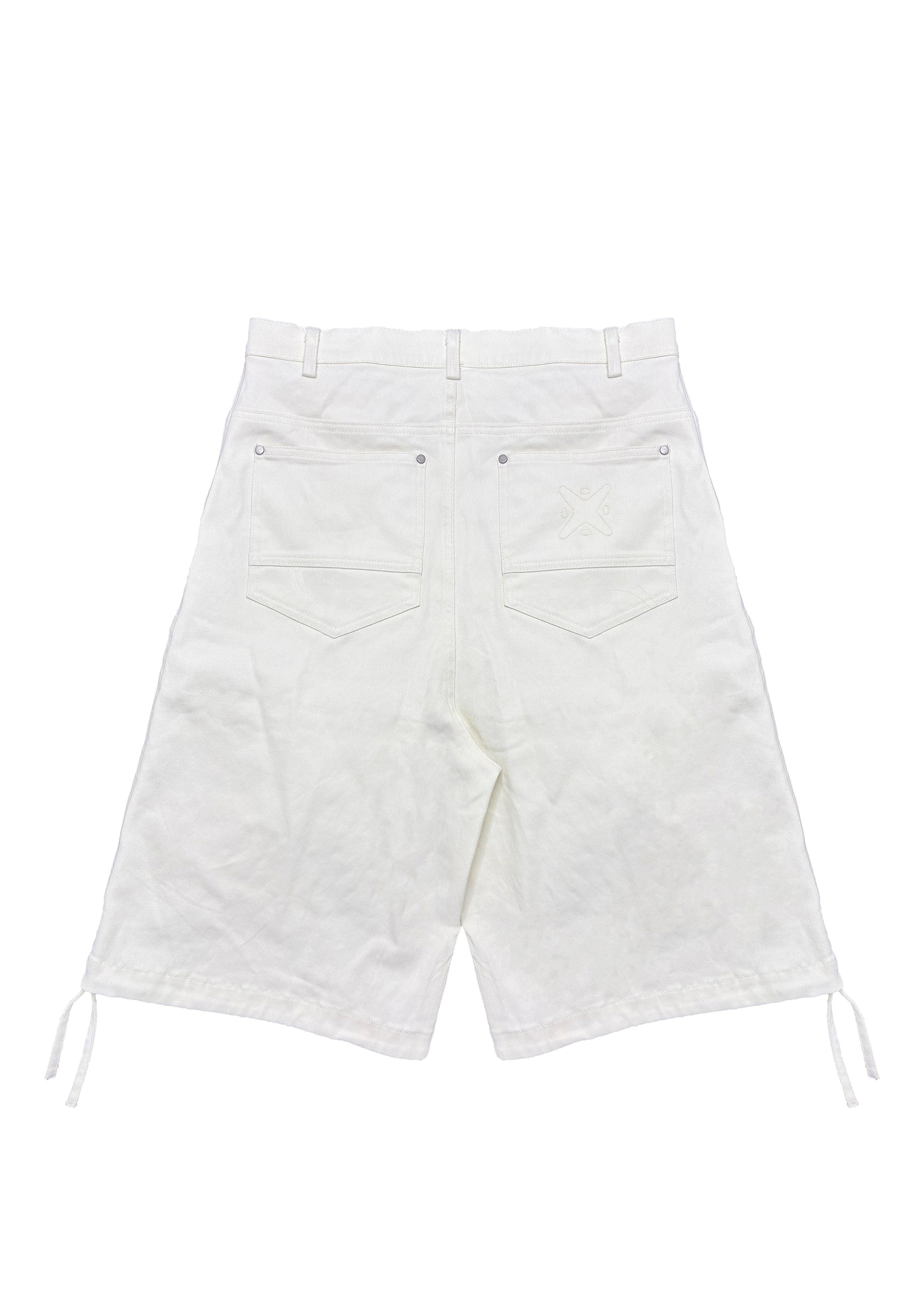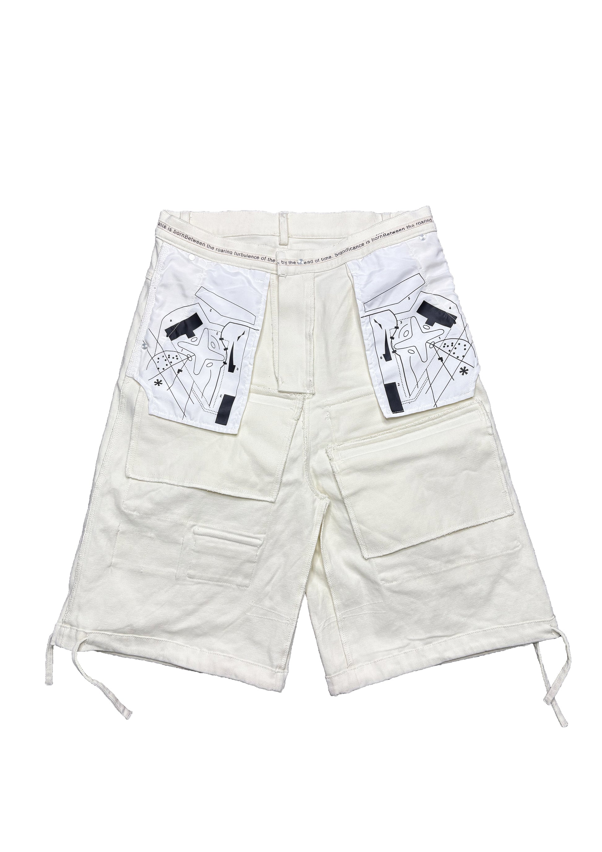 Oversized fit utility shorts constructed from 100% organic hand waxed cotton, featuring an array of storage compartments front and back. Inspired by architectural psychology and nature, this piece draws parallels between natural materials and their relationship with construction materials. These shorts also feature a waistband print and printed pocket bags that reference both design conceptualisation and a schematical drawing.